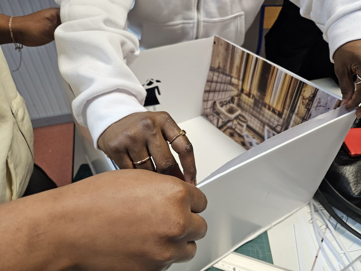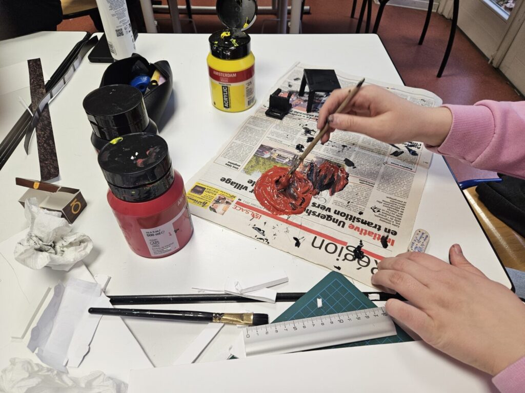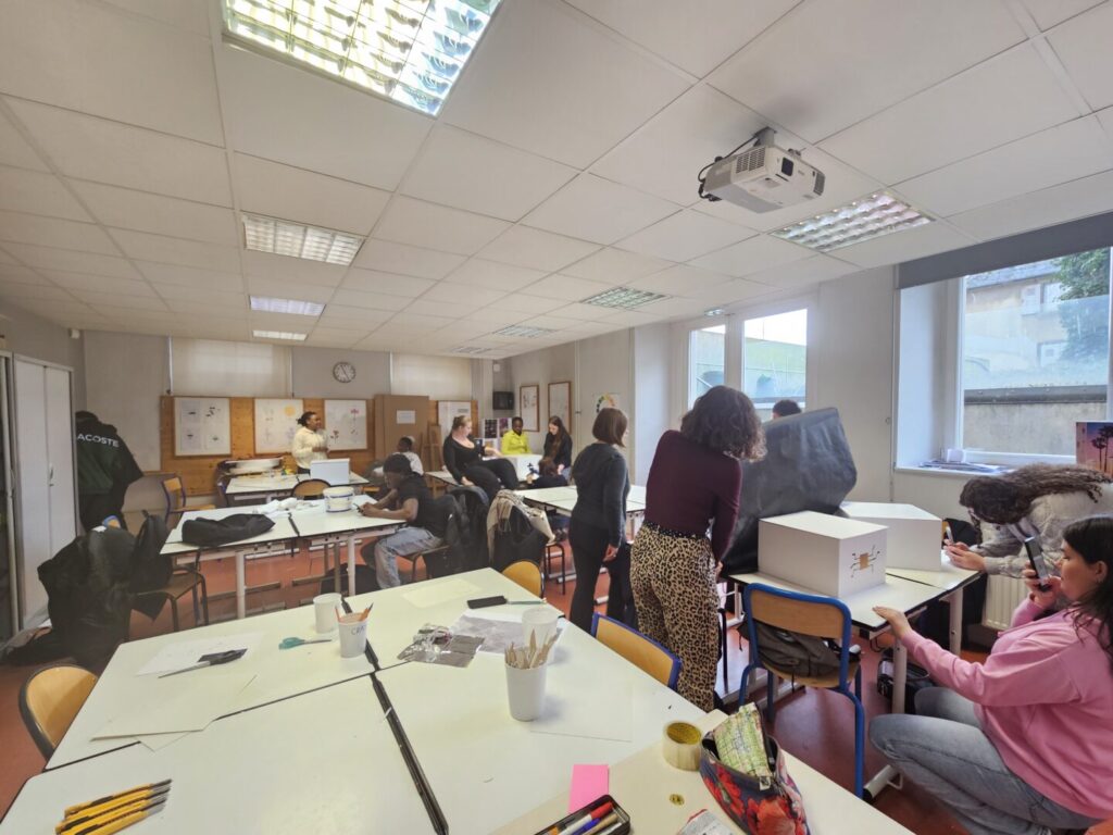 Salle d’arts appliqués : journée de travail intense en créativité de la classe-projet 1ère Bac Pro MCV1 pour fabriquer les Boîtes Animées des 4 romans de la 32ème sélection du Prix Littéraire des lycéens professionnels et Apprentis du Haut-Rhin ! Précision d’importance : les romans ont été lus en entier, à l’ancienne !