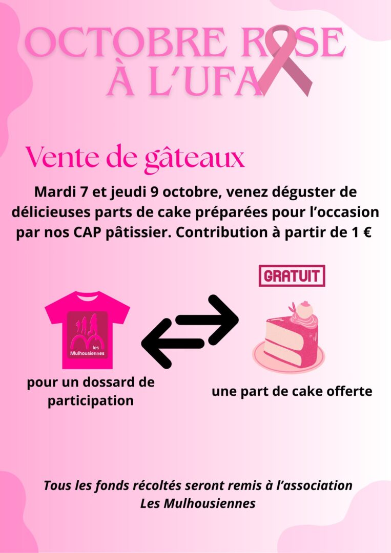 Au cours du mois d’octobre, dans le cadre de notre projet de classe lié à l’examen, nous avons unanimement choisi de soutenir la lutte contre le cancer du sein. Pour concrétiser cette initiative, nous avons organisé une vente de gâteaux préparés par nos apprentis pâtissiers. L’intégralité des fonds récoltés sera reversée à l’association Les Mulhousiennes.
